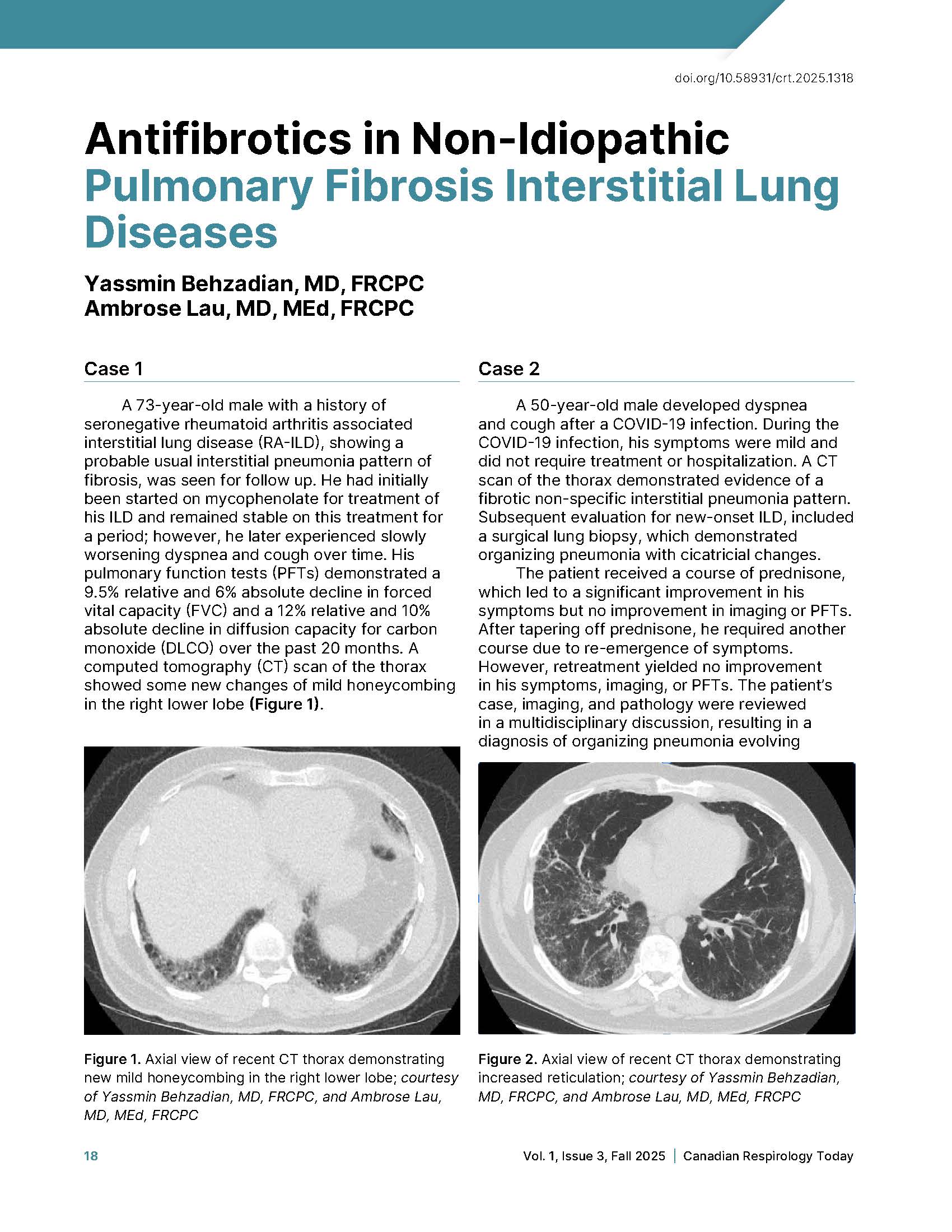 A 73-year-old male with a history of seronegative rheumatoid arthritis associated interstitial lung disease (RA-ILD), showing a probable usual interstitial pneumonia pattern of fibrosis, was seen for follow up. He had initially been started on mycophenolate for treatment of his ILD and remained stable on this treatment for a period; however, he later experienced slowly worsening dyspnea and cough over time. His pulmonary function tests (PFTs) demonstrated a 9.5% relative and 6% absolute decline in forced vital capacity (FVC) and a 12% relative and 10% absolute decline in diffusion capacity for carbon monoxide (DLCO) over the past 20 months. A computed tomography (CT) scan of the thorax showed some new changes of mild honeycombing in the right lower lobe (Figure 1).