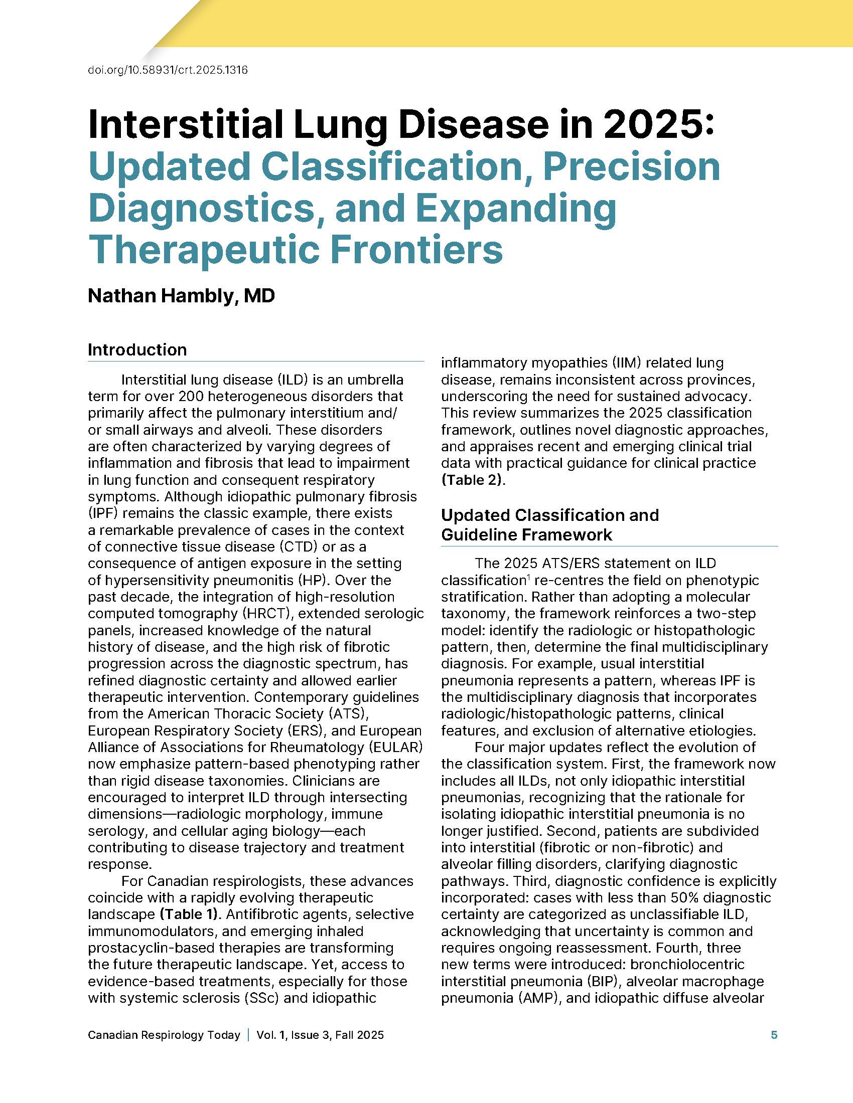 For Canadian respirologists, these advances coincide with a rapidly evolving therapeutic landscape (Table 1). Antifibrotic agents, selective immunomodulators, and emerging inhaled prostacyclin-based therapies are transforming the future therapeutic landscape. Yet, access to evidence-based treatments, especially for those with systemic sclerosis (SSc) and idiopathic inflammatory myopathies (IIM) related lung disease, remains inconsistent across provinces, underscoring the need for sustained advocacy. This review summarizes the 2025 classification framework, outlines novel diagnostic approaches, and appraises recent and emerging clinical trial data with practical guidance for clinical practice (Table 2).